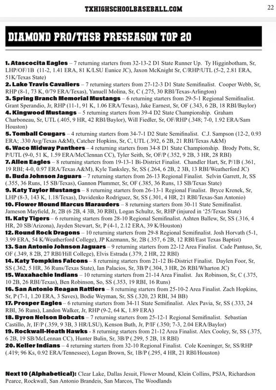 Texas High School Baseball Magazine puts Atascocita #1 In 2026 Preseason Rankings